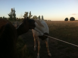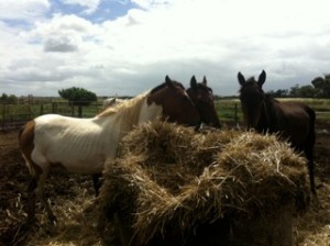 We moved Rosie up to the house paddock to allow more time for handling her, as she did not like anyone picking up her feet, especially her previously injured hind leg. One day I noticed a fracas near a large shed between Rosie and a pony over some hay. Like many horses who have experienced food deprivation, Rosie would get defensive about food.