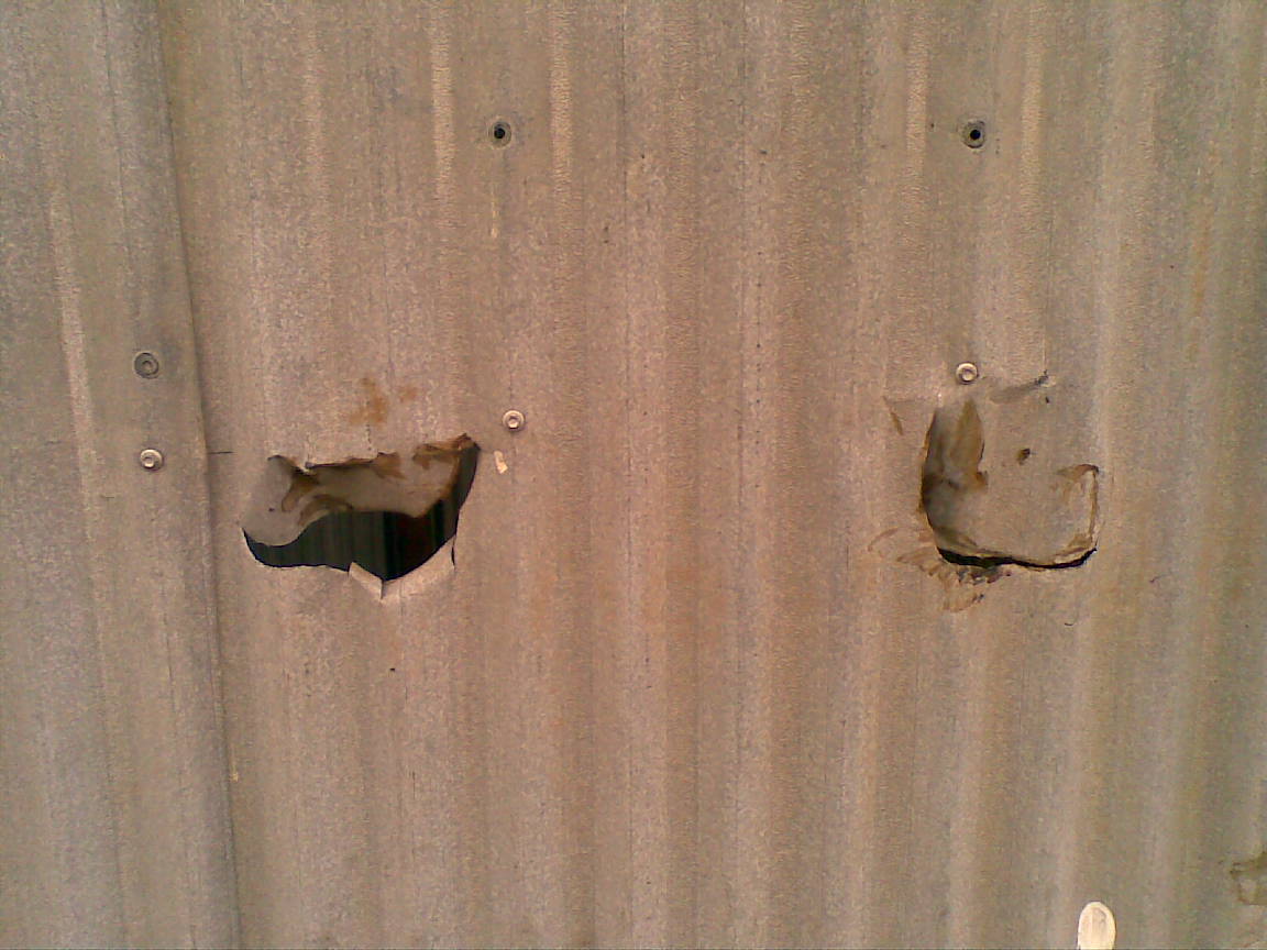 I could not work out how the wound had happened until days later I saw two holes in the shed wall. These were about 2 meters off ground level and showed, on kicking out, Rosie had put BOTH hooves through a solid corrugated iron wall. I felt sickened at what would have happened if she had not been able to release her hooves and how lucky we were that thr was not far more terrible wounds.